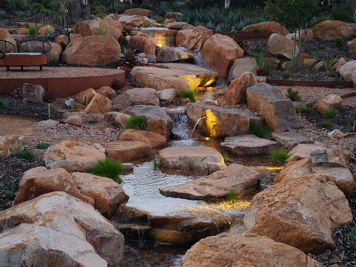 As the sun sets, the experience transforms. Landscape lighting highlights the shimmering water, casting soft reflections across the rocks and surrounding garden beds. The result is an inviting evening ambience; calm, restorative, and ever-changing that can be enjoyed well after daylight fades.
